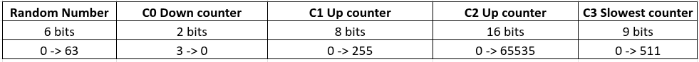 - C3 Slowest counter: 9 bits, this counter increases by 2 each time, this counter increases only when the C1 counter has incremented 256 times.
