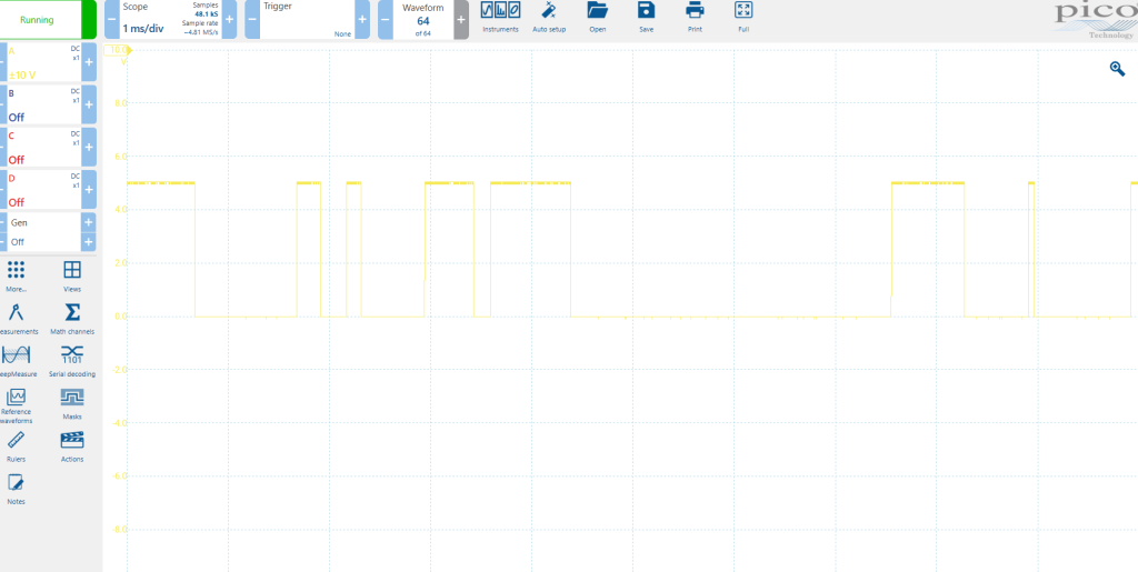 The rolling code is received by the ECU antenna and processed by the 509R-2431 chip. Finally, the rolling code exits through pin 5 (DO) of that chip. This DO signal then enters the ECU’s STM8 microcontroller at pin 36, as shown below: